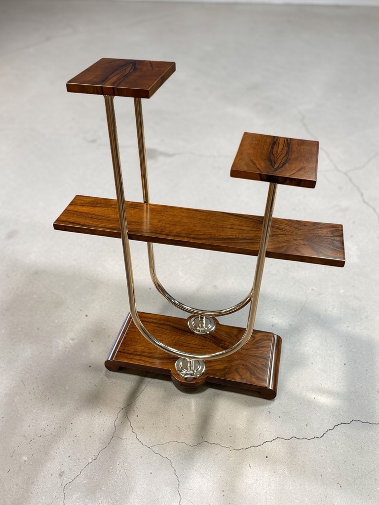 Wyrafinowany, wielopoziomowy kwietnik o wybitnie dekoracyjnym charakterze, utrzymany w estetyce art deco z wyczuwalnym wpływem modernizmu. Przedmiot z lat 30 tych XXw.
