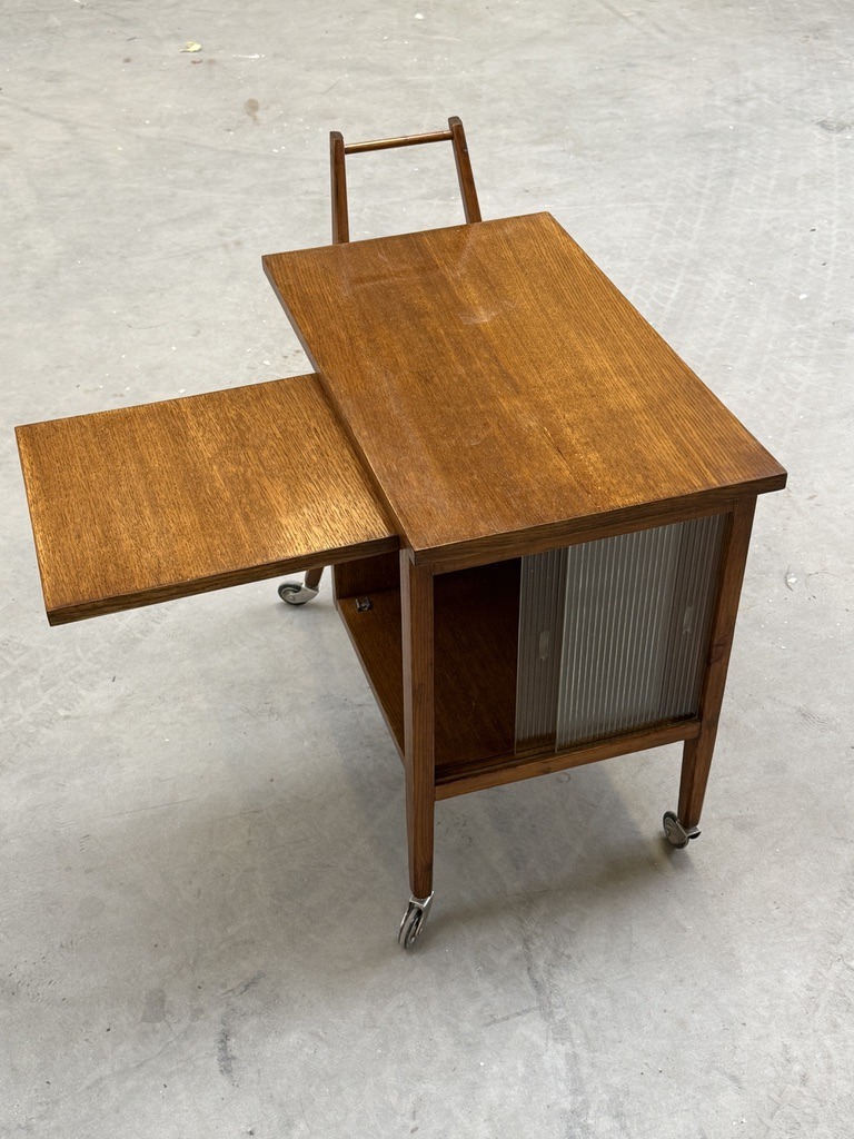 Modernistyczny barek na kółkach.2 250,00 zł Dębowy barek z wyraźnym rodowodem międzywojennego modernizmu, bliski estetyce art déco, choć pozbawiony dekoracyjnej przesady. Prosta forma, gdzie ozdobą jest samo drewno i ryflowane szyby.