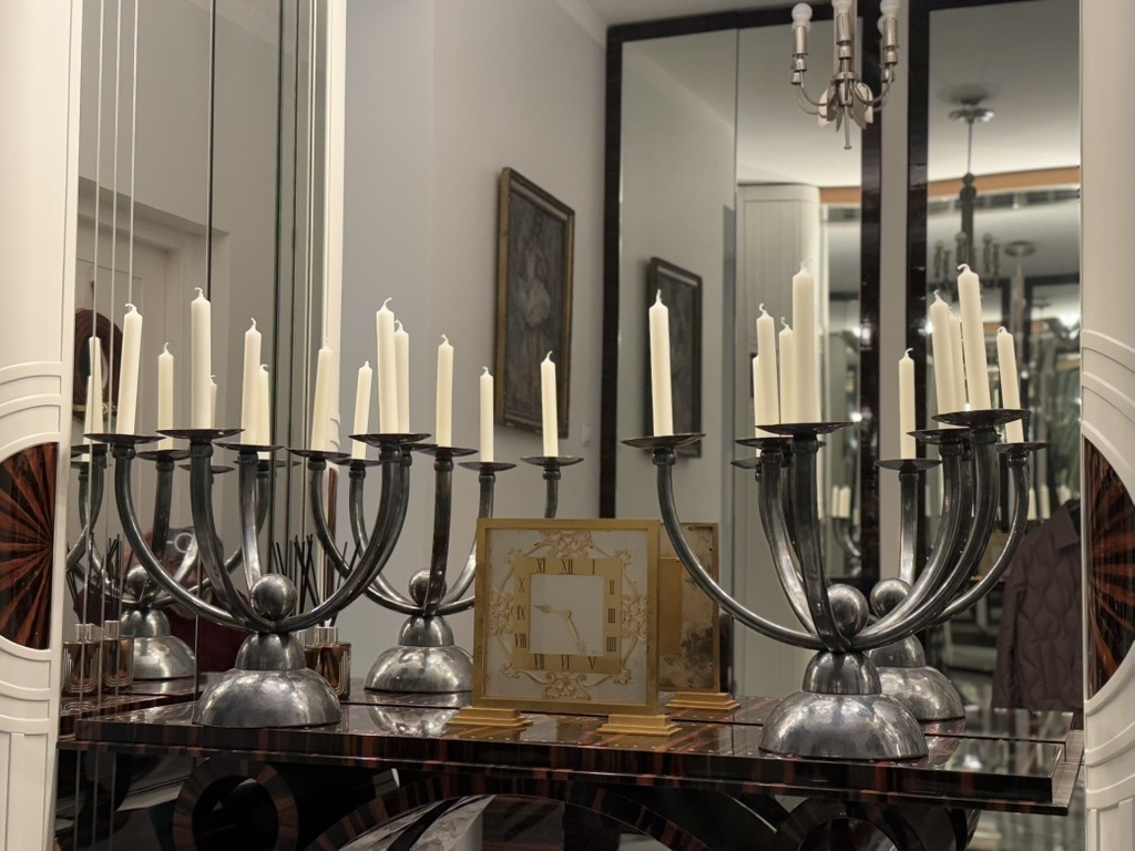 Para bardzo dużych, platerowanych kandelabrów. Niemcy, lata 30te XXw.