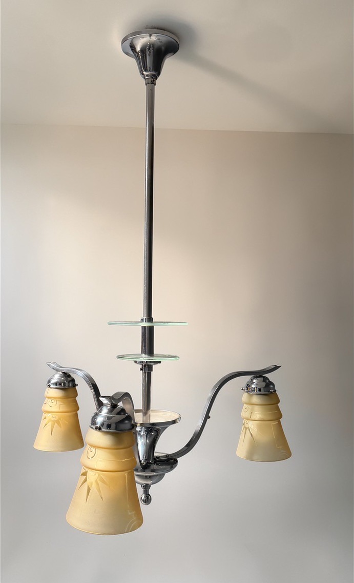 Chromowany korpus, szklane matowione i krawędziowo polerowane talerzyki, a przede wszystkim wspaniałe klosze ze szkła barwionego w masie, trawionego w artdecowskie wzory.